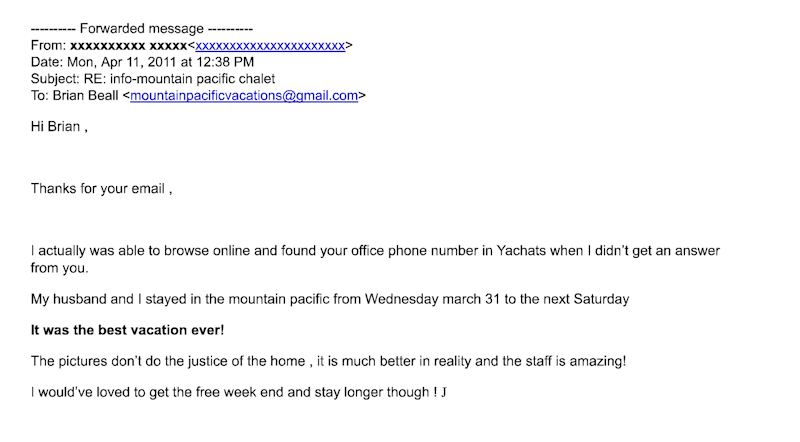We love our Customers and from what They Say, They Love Mountain Pacific Chalet!