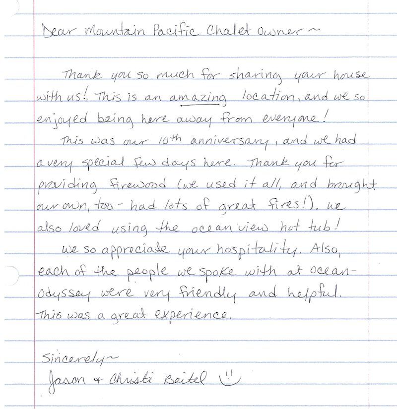 Our vacation to The Mountain Pacific Chalet was the most amazing and memorable vacation I have ever been on. Thank you for providing such a beautiful, relaxing and simply amazing vacation home for us to spend our week in. The house was everything and more than we expected; clean, bright, spacious and beautiful!!! The area the house is in is perfect for fishing, hiking and exploring the ocean. The Mountain Pacific Chalet will always have a special place in my heart because my sweetie asked me to MARRY him there. I am so thankful that he found the PERFECT place for us. Anyone who is lucky enough to rent this place will not regret it. Thank you Brian for everything!